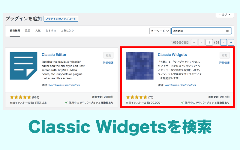 - プラグイン検索メニューからClassic Widgetを検索してインストールします。
