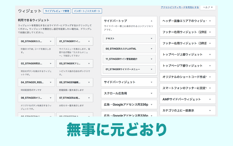 以前のウィジェット設定に慣れている私にとってはブロックウィジェットはかなり使いにくかったので、旧バージョンのウィジェット設定に戻してみます。