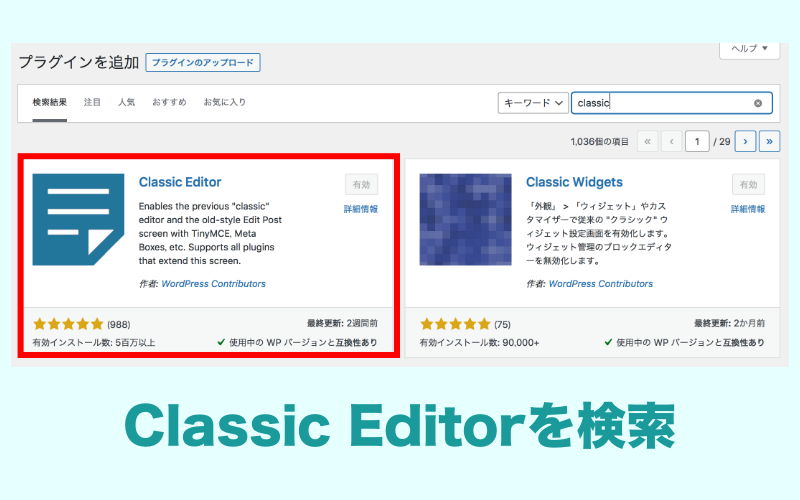 クラシックエディターへの変更方法も同様に、プラグイン検索でClassicと検索すると、「Classic Editor」が検索結果に表示されますので、そのままインストールします。